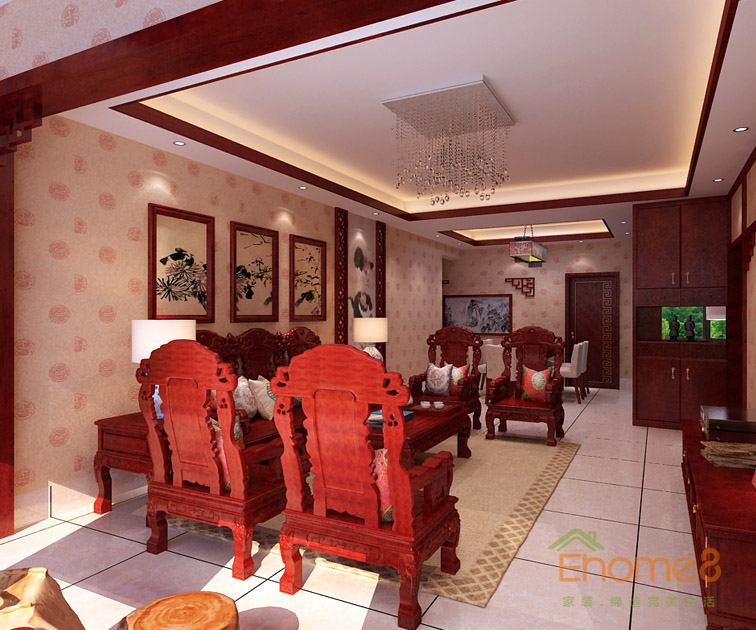 陽光花園66㎡兩房一廳中式原木風格裝修效果圖