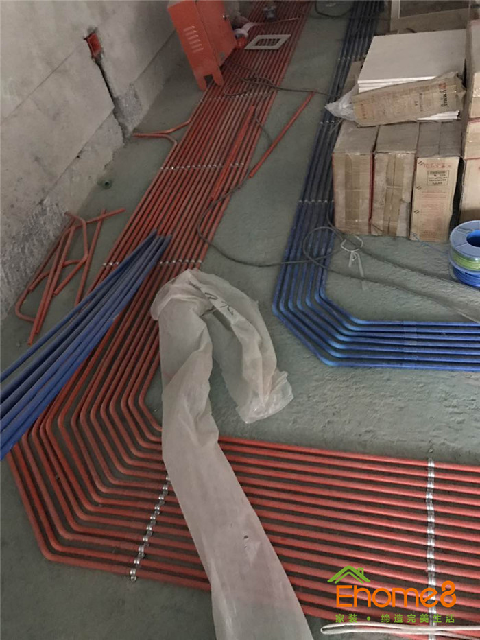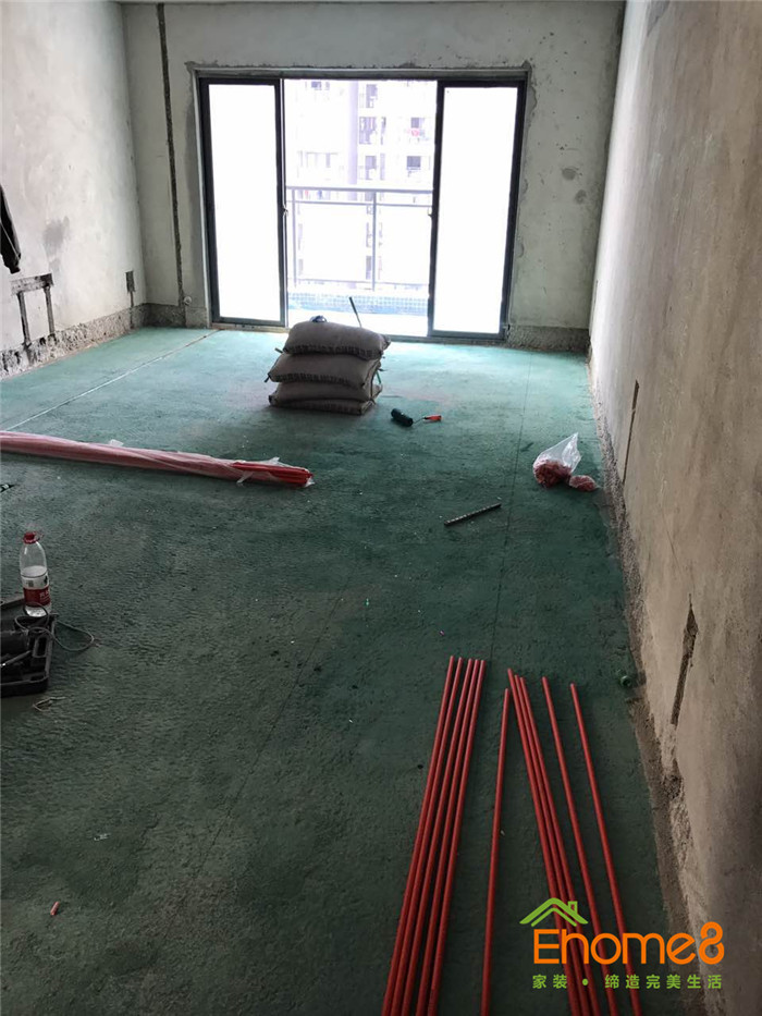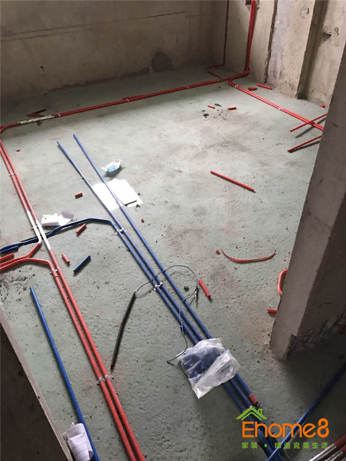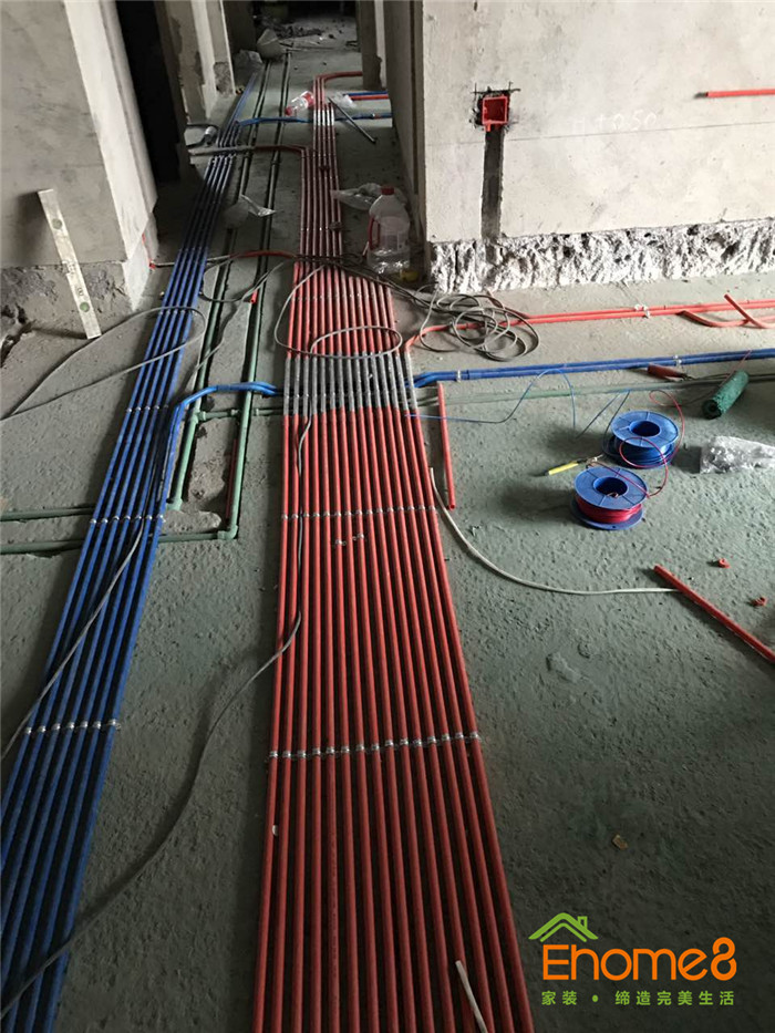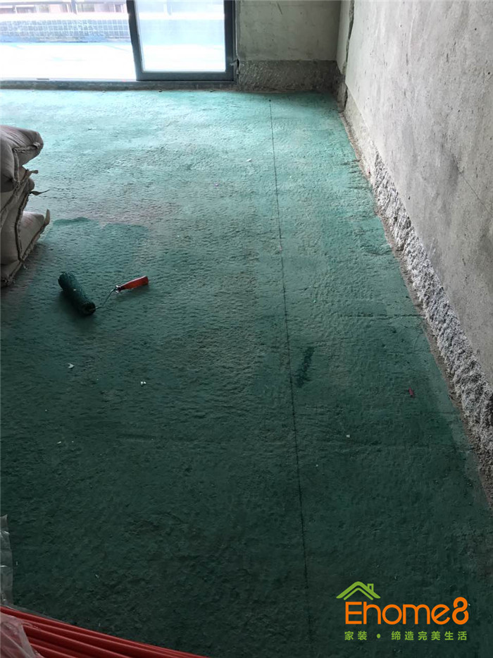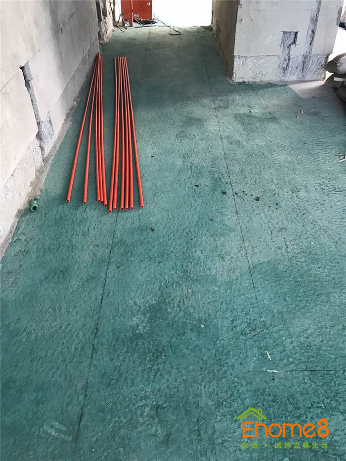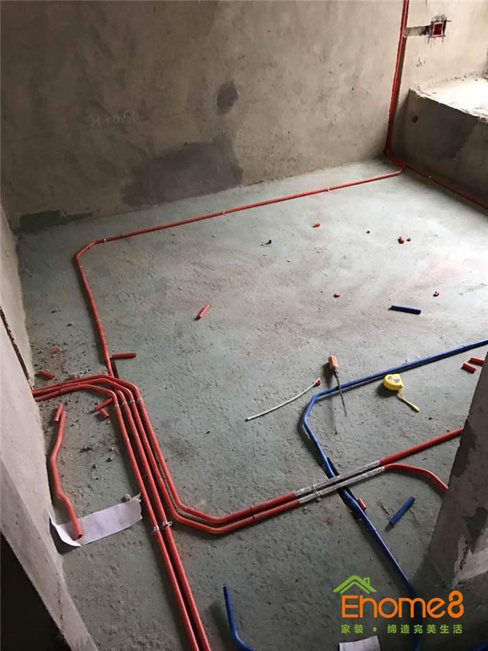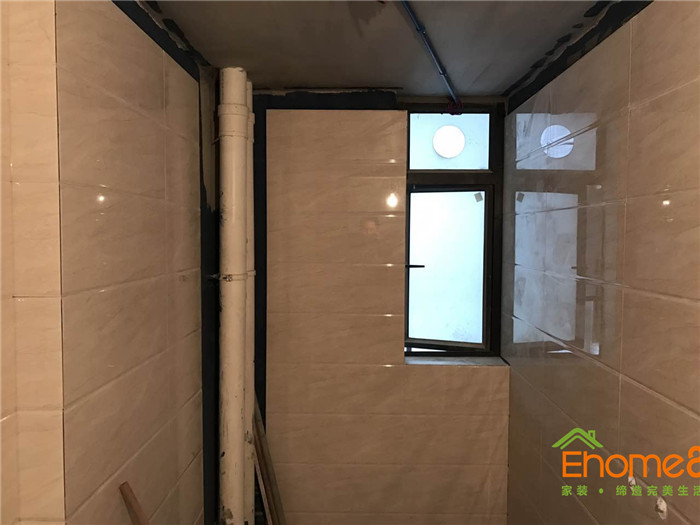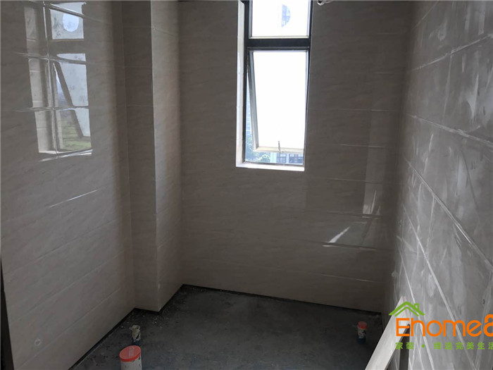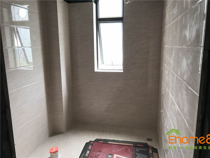 墻磚鋪貼,使用水平儀投射水平線,陽角處采用磨邊45°碰角工藝。