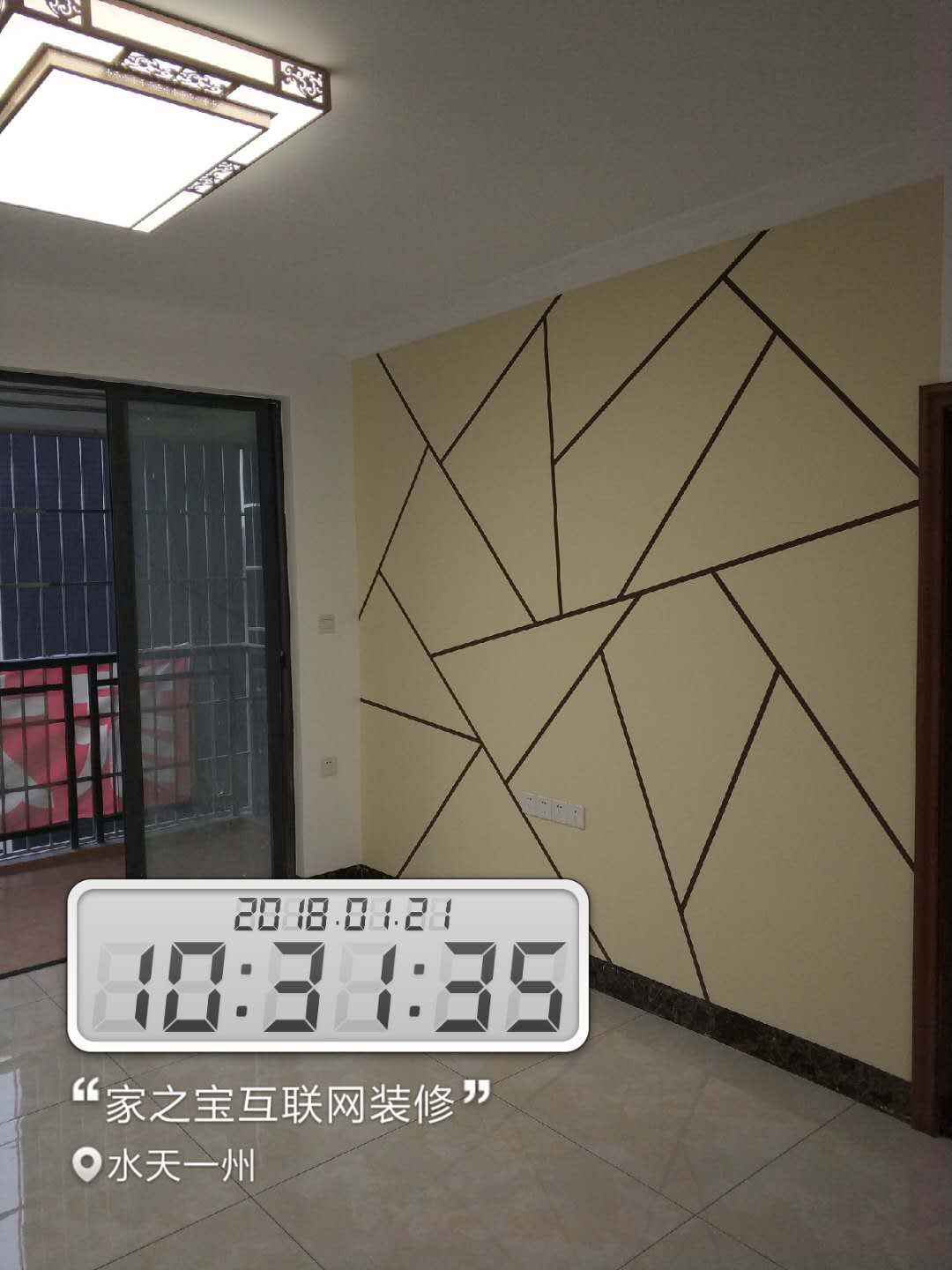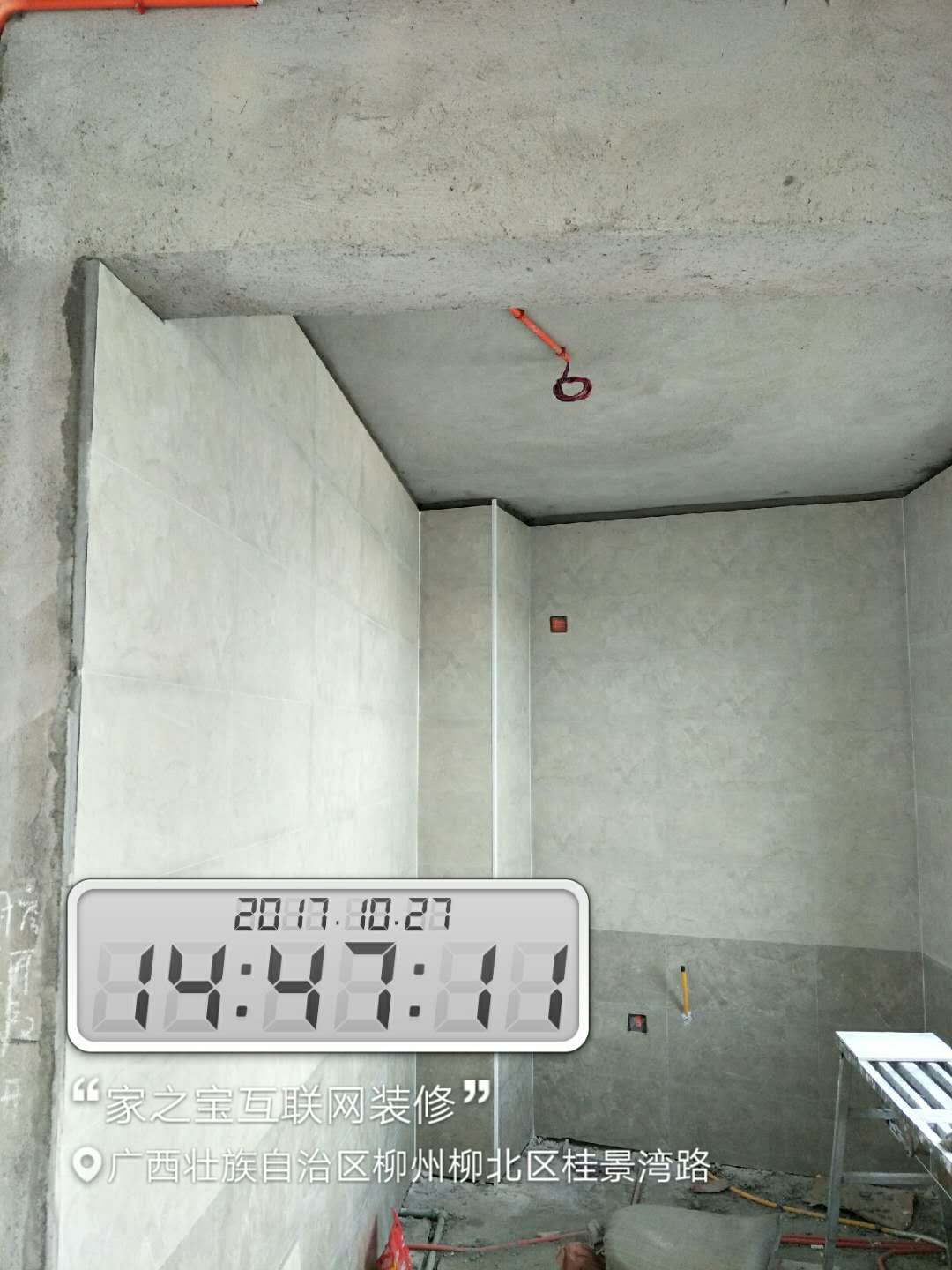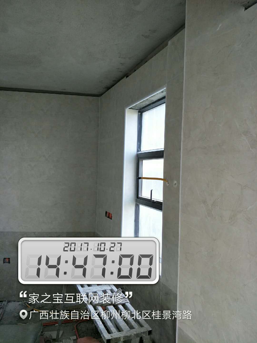 墻磚鋪貼,使用水平儀投射水平線,陽角處采用磨邊45°碰角工藝。
