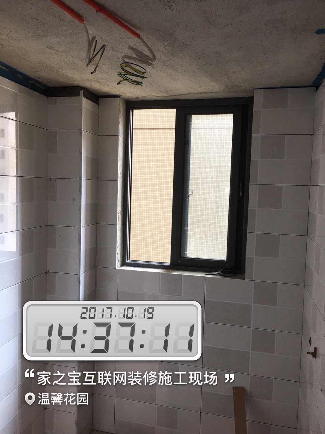 墻磚鋪貼,使用水平儀投射水平線,陽角處采用磨邊45°碰角工藝。